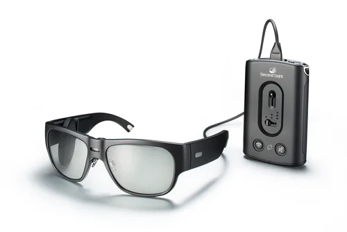 The Argus II implant, from Second Sight Medical Products, consists of an array of electrodes that transmits energy directly to a patient’s retina. The patient must wear a set of external hardware that includes Eyewear with a camera, RF antenna, and PCB, and a Video Processing Unit (VPU) with user controls.
